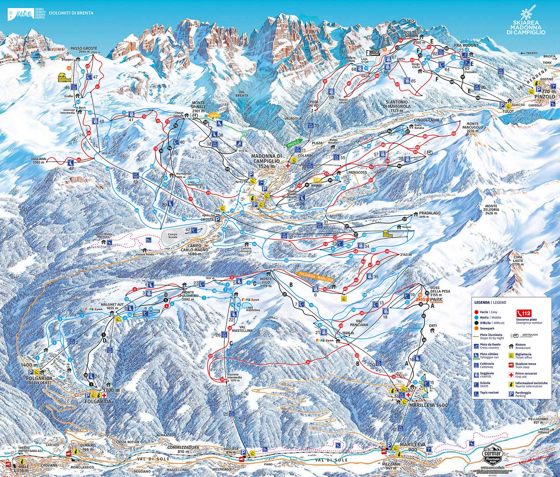 SkiArea Campiglio Dolomiti di Brenta to jeden karnet na połączone wyciągami tereny Madonny di Campiglio, Folgaridy–Marillevy i Pinzolo. Z jednym biletem jeździsz płynnie między ośrodkami, bez zdejmowania nart—od rodzinnych, szerokich niebieskich po sportowe czerwone i czarne odcinki.